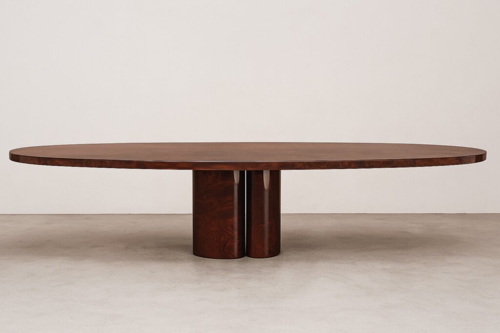 Table 0052 is defined by a strong horizontal gesture supported by a central sculptural base. The elongated oval top rests on paired cylindrical volumes, creating a composition that balances mass, symmetry, and refined proportion. The high-gloss burl wood veneer reveals a rich, organic grain that contrasts with the table’s controlled geometry. Light activates the surface subtly, emphasizing depth and material richness without overpowering the form. Positioned between function and sculpture, 0052 serves as a grounding element within a space—quietly monumental, materially expressive, and reduced to an essential architectural statement.