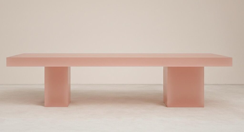 This table is conceived as a horizontal plane supported by two solid, architectural volumes. Defined by clarity and restraint, its geometry emphasizes balance, rhythm, and material presence rather than ornament. The extended tabletop appears to float above the supporting blocks, creating a composed tension between mass and levity. The lacquered finish unifies the piece into a single, continuous surface, allowing light to subtly activate its planes and edges. Positioned between function and sculpture, this table operates as a grounding element within a space—quiet yet assertive, reduced to its essential architectural gesture.