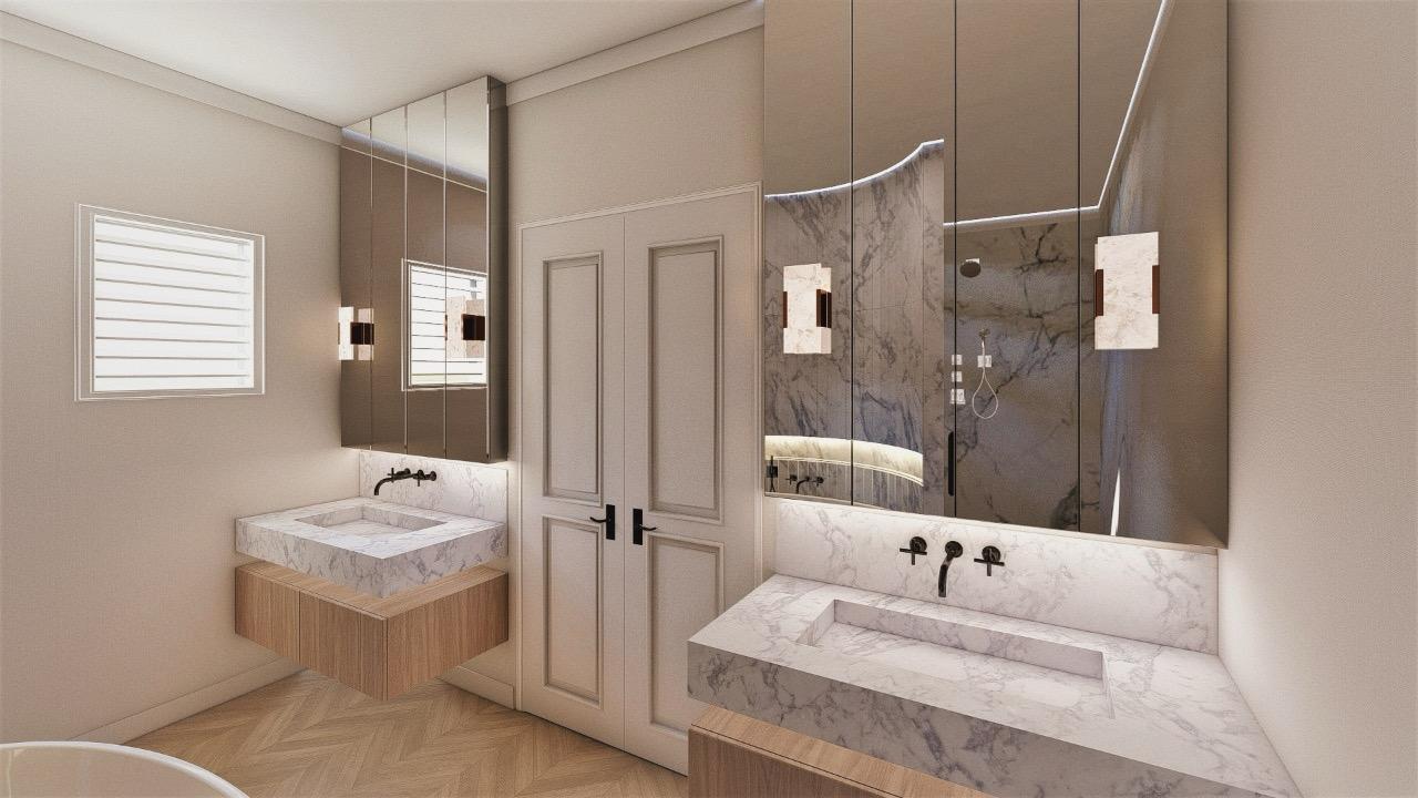 A dialogue between tradition and modern refinement. The architecture retains its classical bones while contemporary interventions bring balance and lightness. Minimal detailing, sculptural lighting, and curated objects transform the space into a composition of quiet grandeur.