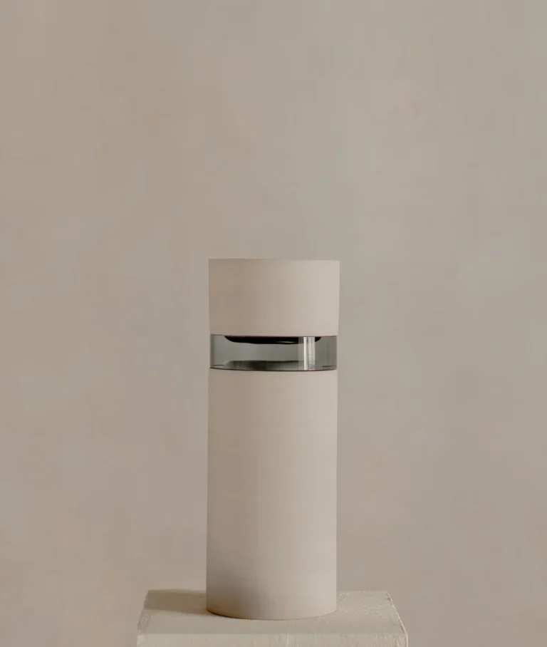 A refined sculptural object that bridges craftsmanship and minimalist form. With a clean cylindrical silhouette, tactile clay surface, and subtle transparency, it brings quiet elegance and material depth to any space. Ideal for styling with intention—this piece transforms a shelf, console, or niche into a moment of calm and design.
